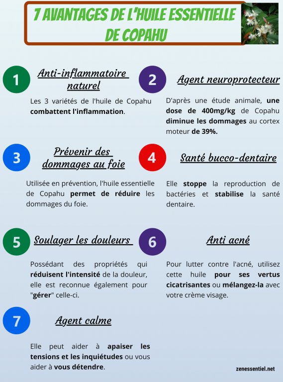 Quels sont les avantages de l’huile essentielle de copahu ? Parmi les bienfaits possibles de l’huile essentielle de copaiba, mentionnons sa capacité d’agir comme anti-inflammatoire naturel, neuroprotecteur, préventif possible des dommages au foie, stimulant pour la santé bucco-dentaire, analgésique, améliorant la peau et agent calmant.