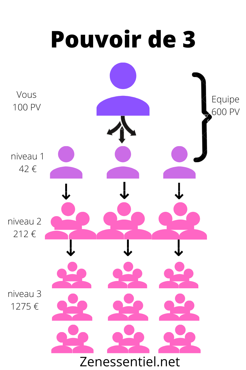 Lorsque vous parrainez 3 personnes, si vous passez chacun une commande d’au moins 100 PV et que l’ensemble des 4 commandes atteint au moins 600 PV, vous touchez 42 €/mois. (Astuce : placez une commande de 150 PV).