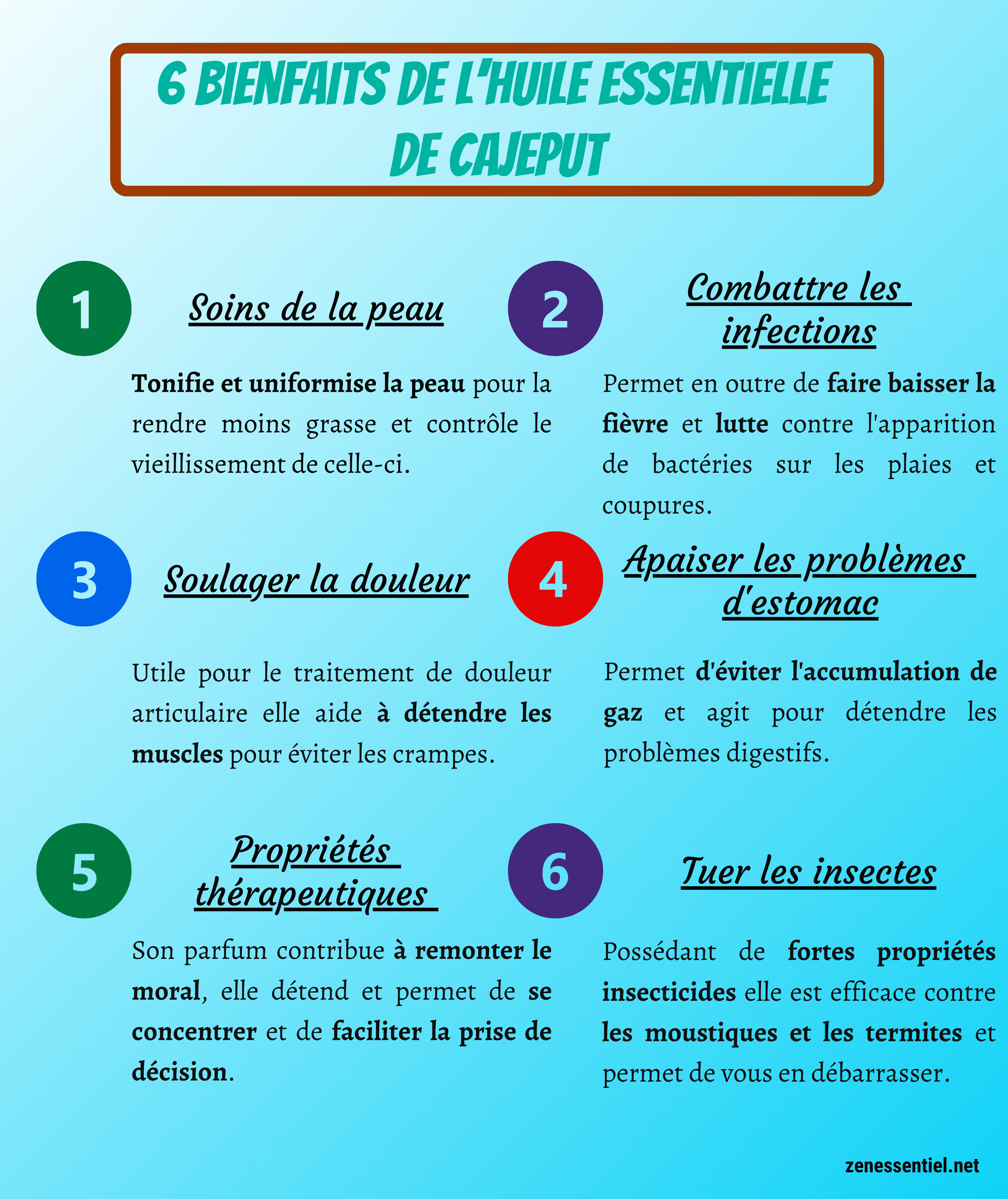 L’huile essentielle de cajeput possède des propriétés antiseptiques qui aident le système immunitaire à combattre les infections et les virus. Cette huile essentielle est utilisée en médecine traditionnelle pour traiter les maux de gorge, les infections digestives et la toux. L’huile essentielle de cajeput peut être appliquée localement sur les blessures, les coupures et les éraflures pour prévenir les infections. Cette huile essentielle a également des propriétés antibactériennes qui aident à lutter contre les bactéries qui peuvent vous rendre malade pendant la saison de la grippe. Une étude a révélé que les principaux composés responsables de ces bienfaits pour la santé sont l’alpha-terpinéol et l’eucalyptol. (2)