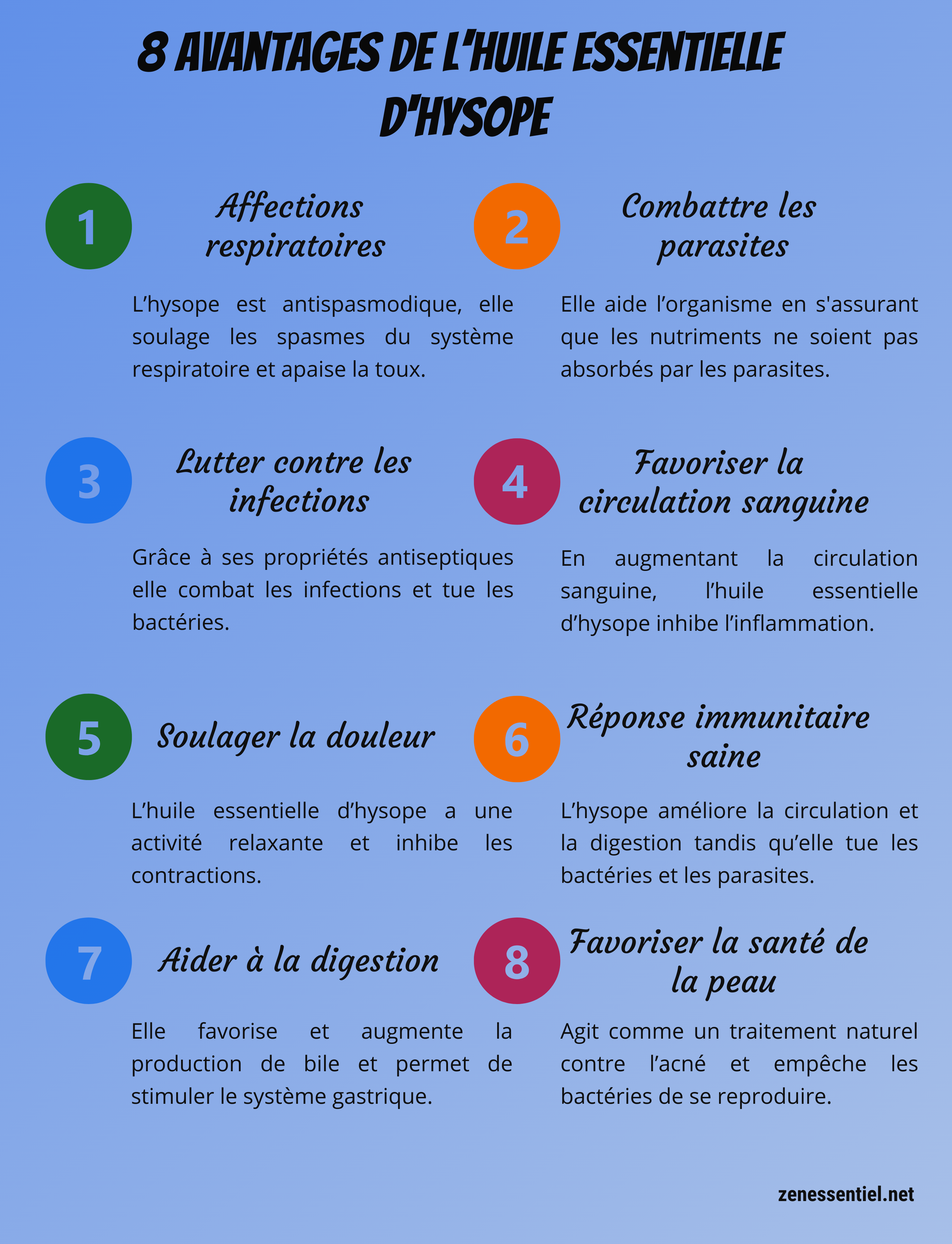 A quoi sert l’huile essentielle d’hysope ? Les problèmes respiratoires, les parasites, les infections, les troubles digestifs, l’acné, les douleurs musculaires et les spasmes musculaires sont autant de problèmes qui figurent en tête de liste des bienfaits de l’hysope.