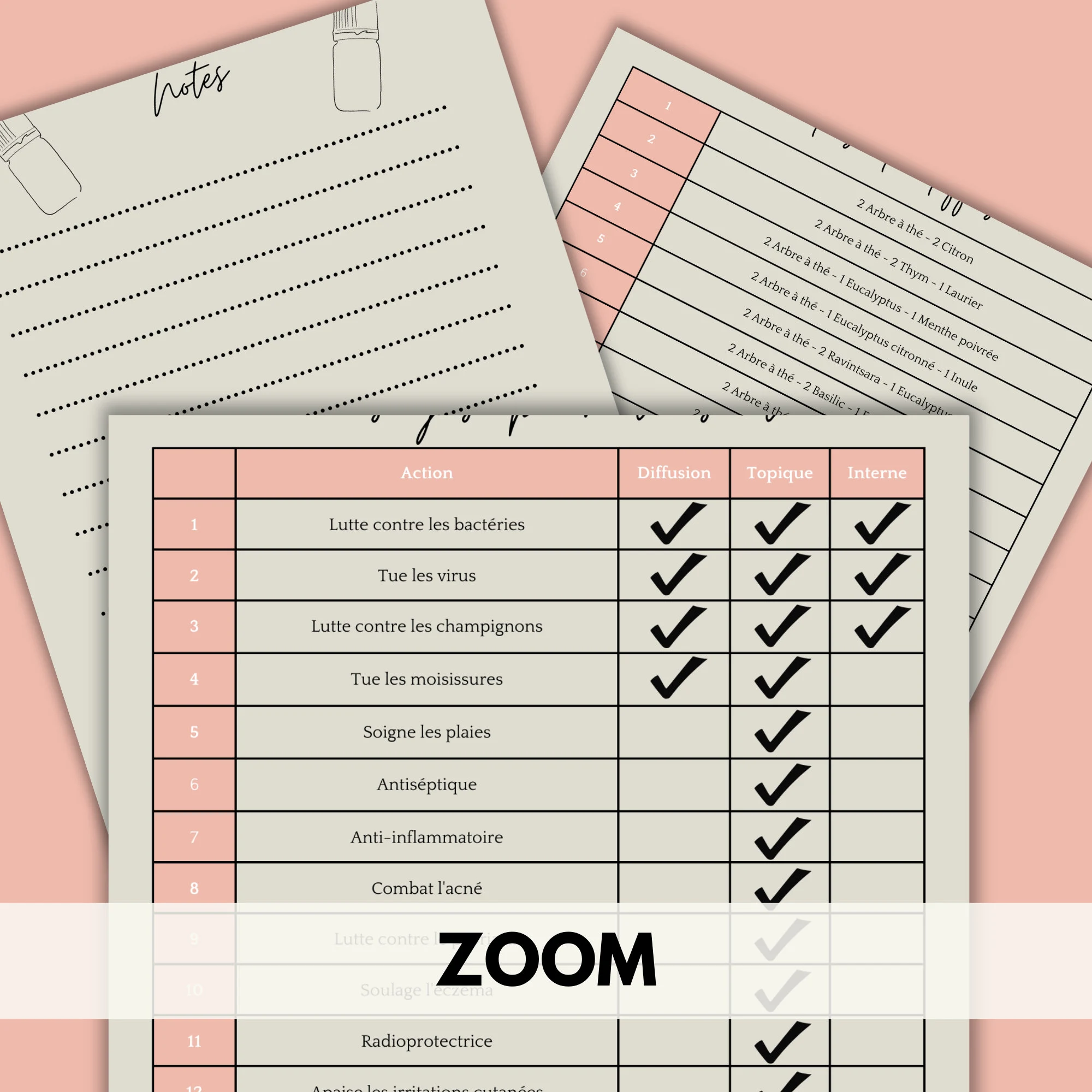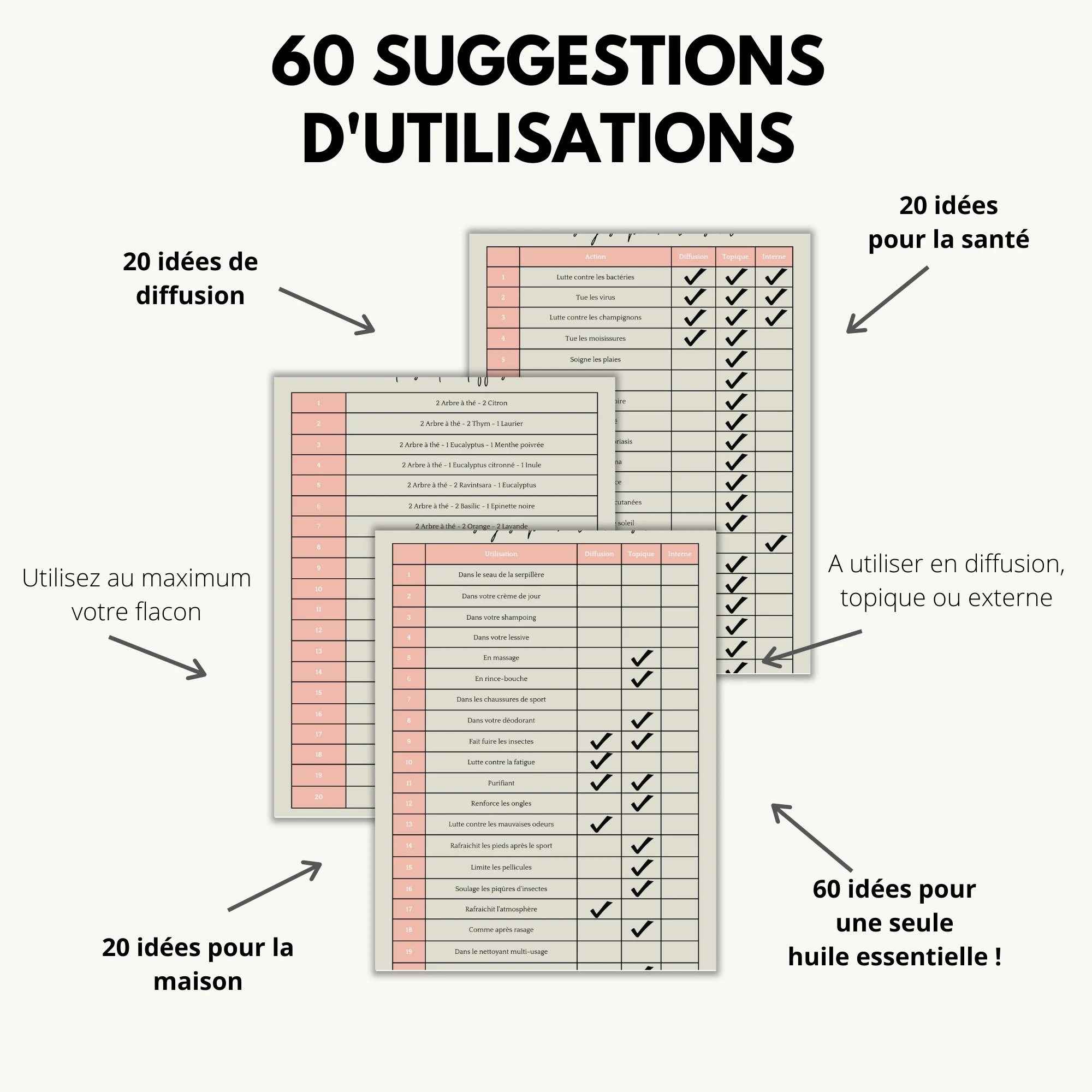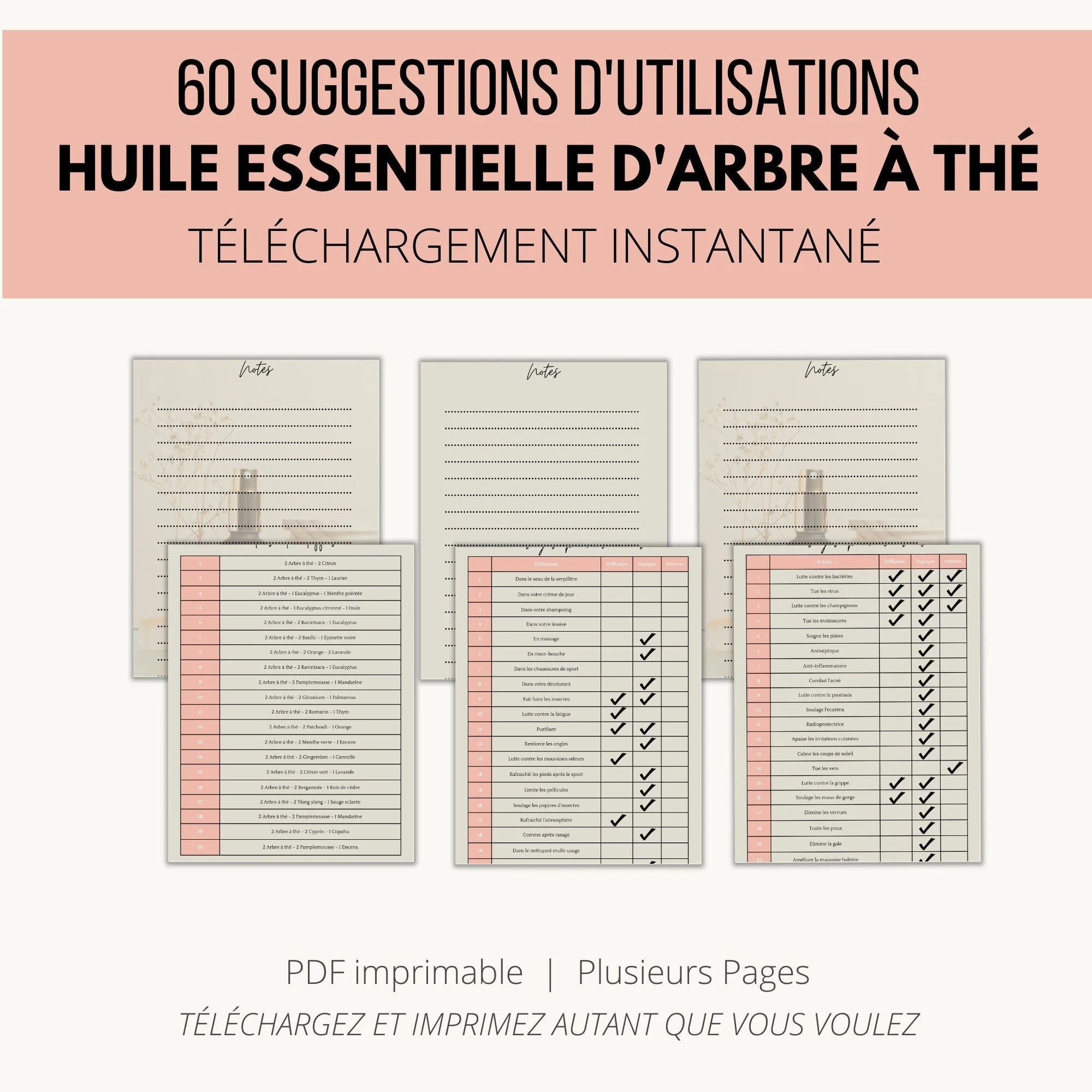 Vous cherchez des idées sur la façon d’utiliser votre huile essentielle d’arbre à thé ? Ne cherchez pas plus loin que ce guide utile ! Cette fiche propose 60 suggestions d’utilisation de l’huile essentielle de tea tree, réparties en 20 pour la santé, 20 pour la maison et 20 pour les mélanges à diffuser. C’est une excellente ressource à garder à portée de main pour que vous puissiez toujours tirer le meilleur parti de votre flacon. De plus, elle est disponible en cinq couleurs tendance – bleu, rose, orange, vert et taupe – afin que vous puissiez choisir celle qui correspond le mieux à votre style.